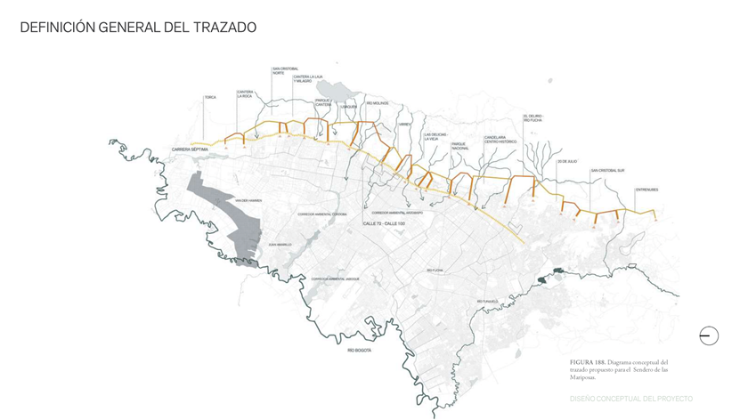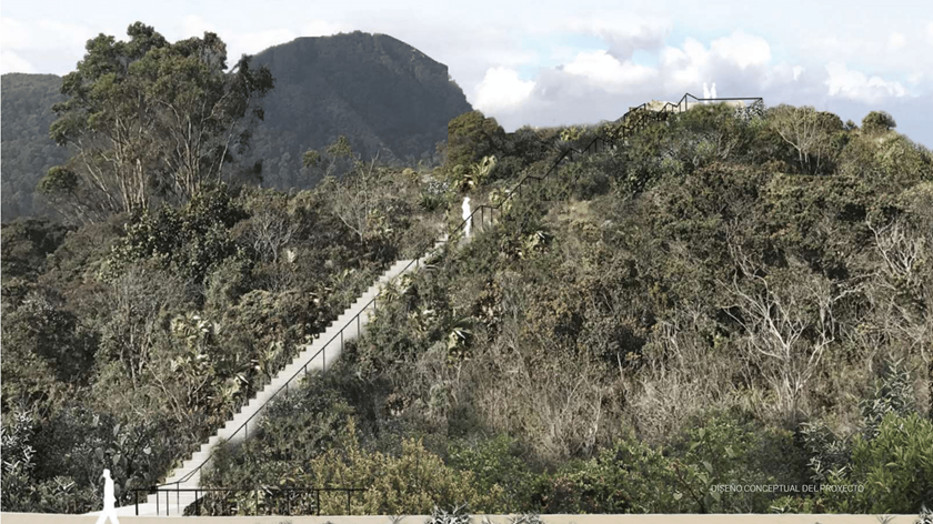 Las Mariposas Trail is an ecological project that aims to connect the eastern hills of Bogotá via a scenic pedestrian corridor, stretching from the Patiño Ravine in the Usaquén district to the Fucha Ravine in the Usme district. The trail traverses the eastern hills within the Bosque Oriental de Bogotá (Eastern Forest of Bogotá) protected forest reserve, managed by the Regional Autonomous Corporation of Cundinamarca (CAR). The trail connects with other paths, allowing for a multi-stage route and offering the public an opportunity to appreciate and enjoy this natural heritage. The project has multiple objectives: to strengthen ecological connectivity between forest fragments, promote environmental education, foster ecotourism, and serve as infrastructure for preventing forest fires. Along the trail, several rest areas, logistics points, environmental classrooms, viewpoints, and hundreds of bridges are planned, including two special structures: a suspension bridge and a cable-stayed footbridge.